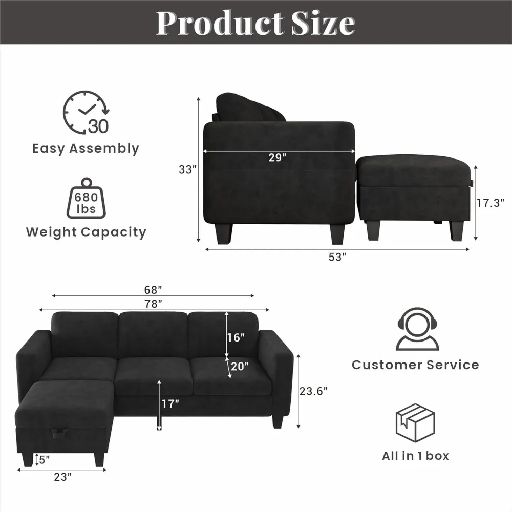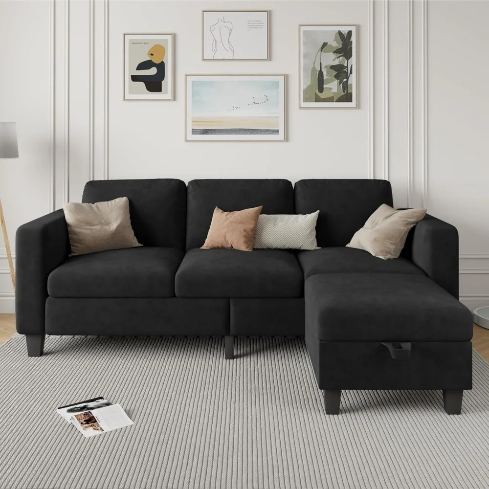 Sectional Sofa and Couches for Living Room - 78''L Shaped Black Velvet Couch-Pet Friendly Modular 3-Seater Convertible Sofas-Was