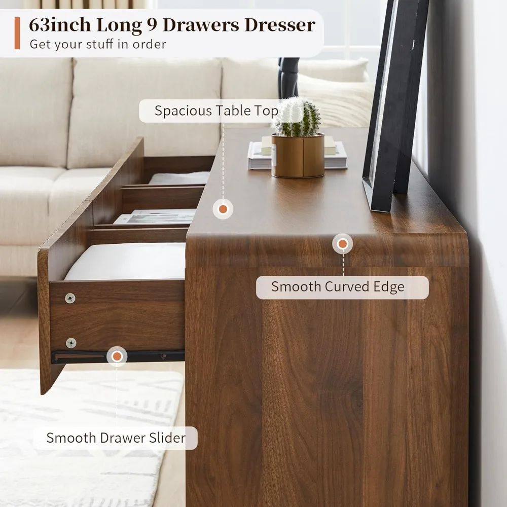 • Sleek & Modern Design: Elevate your home décor with this wood 9-drawer dresser , where contemporary elegance meets functional simplicity. The hidden handle design delivers a seamless, clutter-free aesthetic, while the gently rounded edges soften sharp corners—adding a refined touch that enhances both safety and sophistication. Crafted with wood-grain finishes and fluted panel detailing , this extra-wide dresser (15.75"D x 63"W x 31.5"H) effortlessly complements modern, contemporary, or transitional interior styles, making it a bold yet versatile addition to any space.