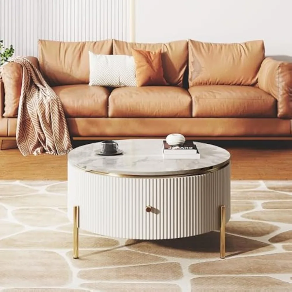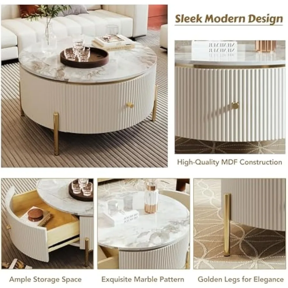 31.5 Round Coffee Table with 2 Large Drawers Storage Modern Exquisite Marble Pattern Golden Legs for Elegance Living Room, Whit