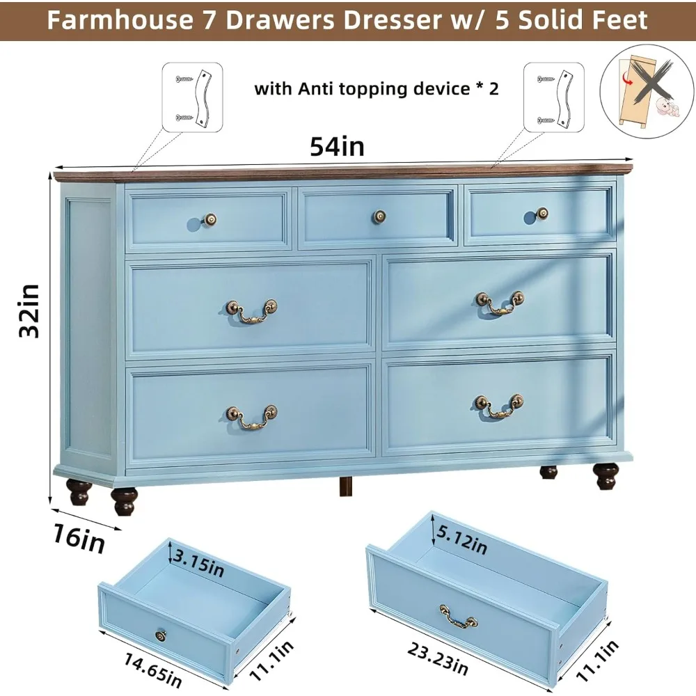 Farmhouse 54" 7 Drawers Dresser for Bedroom, Wide Wood Chest of Drawers w/ 4 Wooden Legs, Vintage Large Storage Dressers Organiz