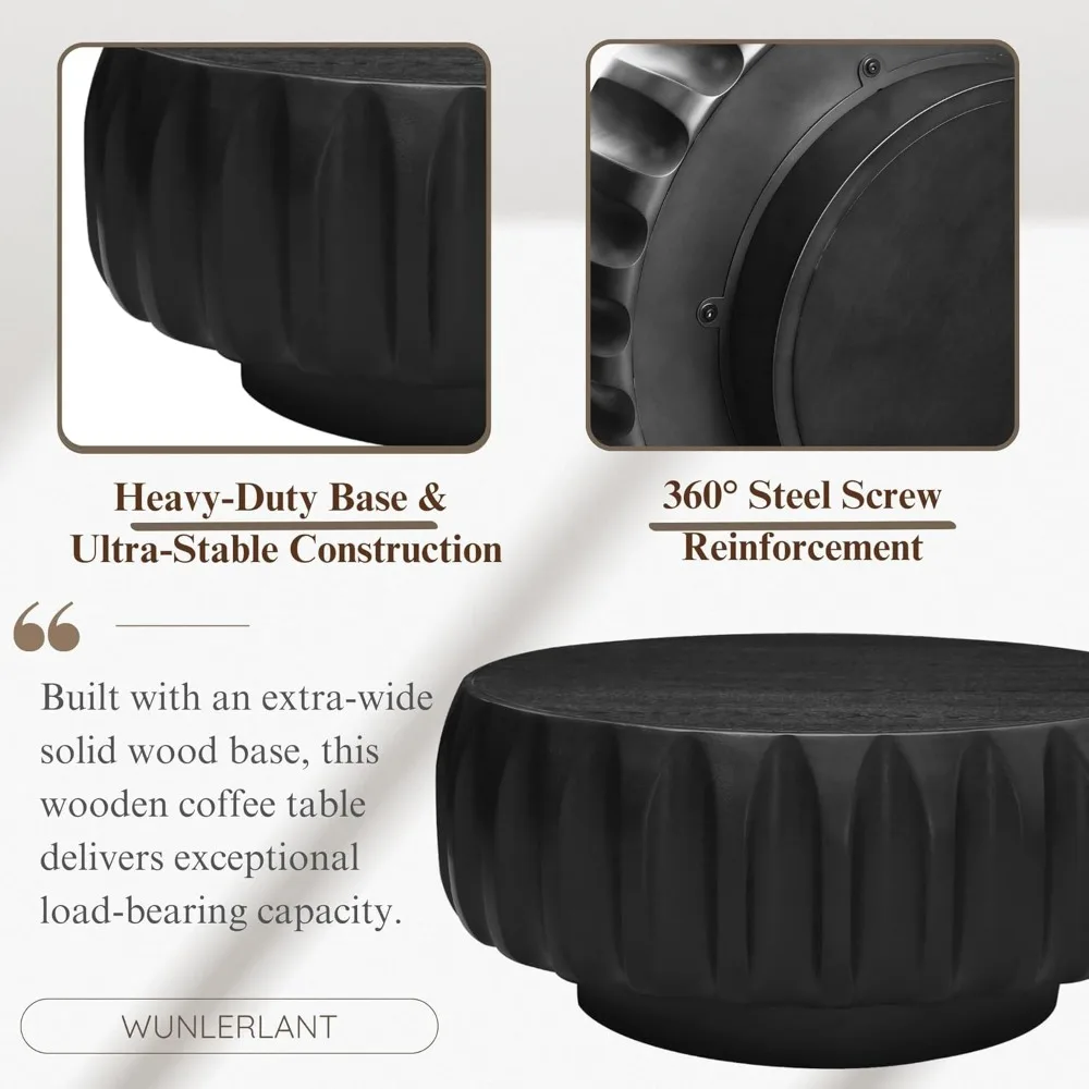 31.5" Round Black Coffee Table - Mid Century Modern Solid Wood Coffee Tables with Fluted Design for Living Room, Small Space, Ap